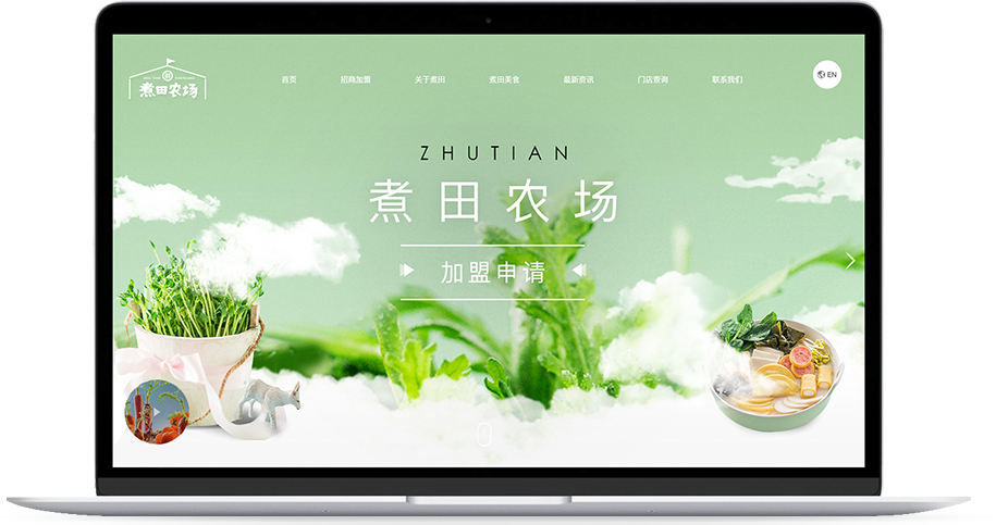 以“農場”“新鮮”為創意設計靈感,將農產品融入網頁背景中;以沉浸式的瀏覽體驗,將煮田農場的產品特色、服務理念及加盟條件娓娓道來,為瀏覽者帶來舒適、溫馨感,同時也完美闡釋煮田農場的網絡形象。